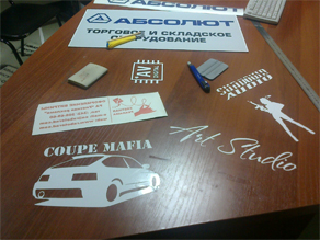 Плоттерная резка - используется для изготовления аппликаций на стекло витрин, стекло и борта транспортных средств, информационные стенды. Для переноса изображения с подложки на поверхность используется монтажная пленка со слабым клеевым слоем. С ее помощью рисунок отклеивается от бумажной подложки и переносится на нужную поверхность. После приглаживания наклейки к носителю, монтажная плёнка удаляется. Наносить плёнку можно почти на любую гладкую поверхность: металл, пластик, бумагу, ткань, стекло.