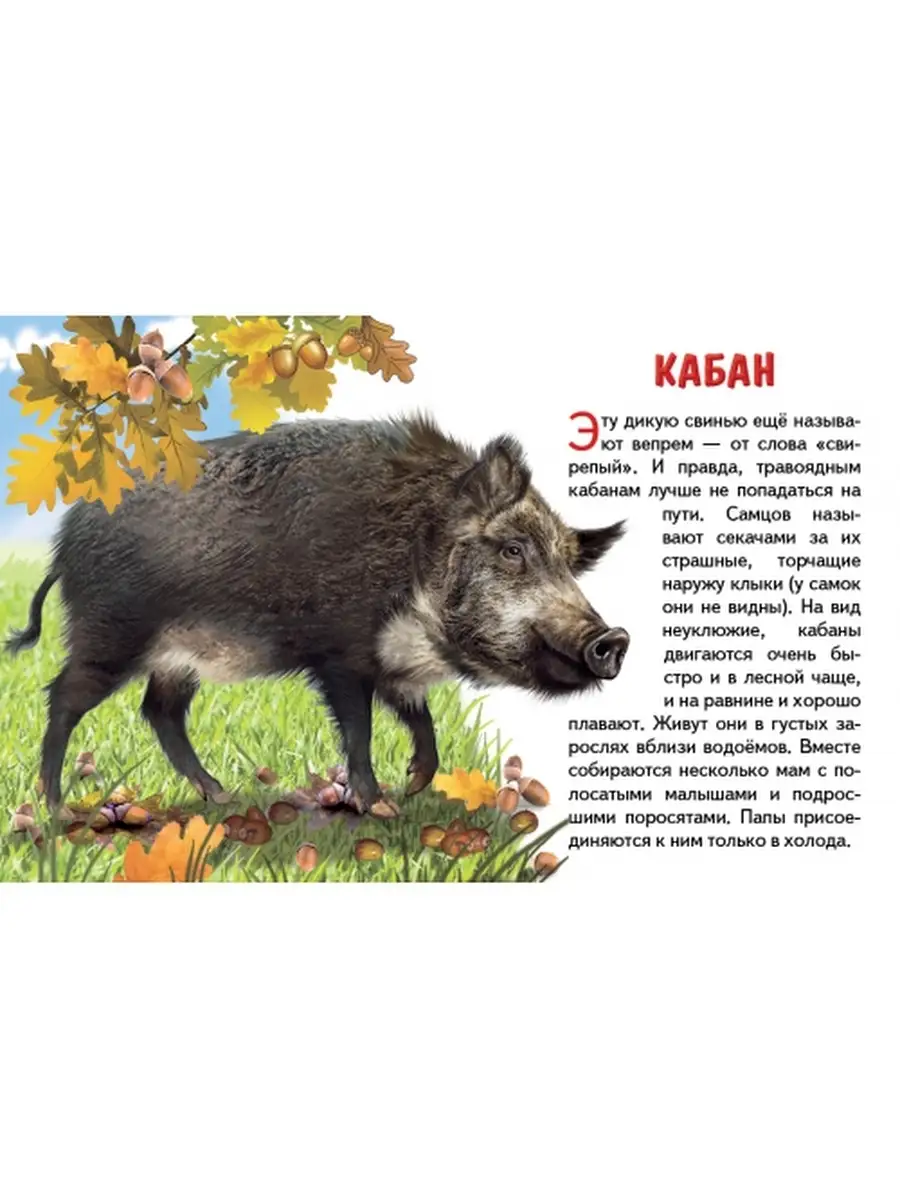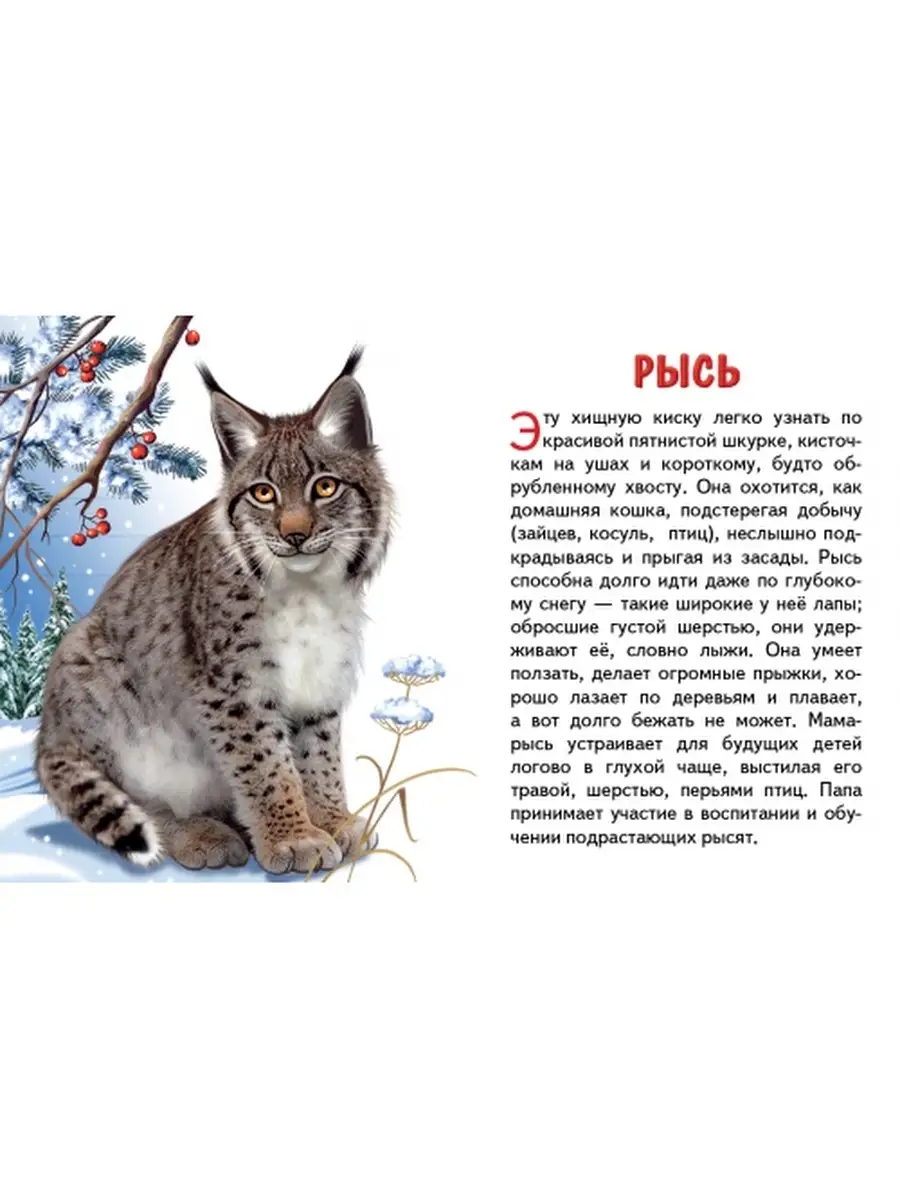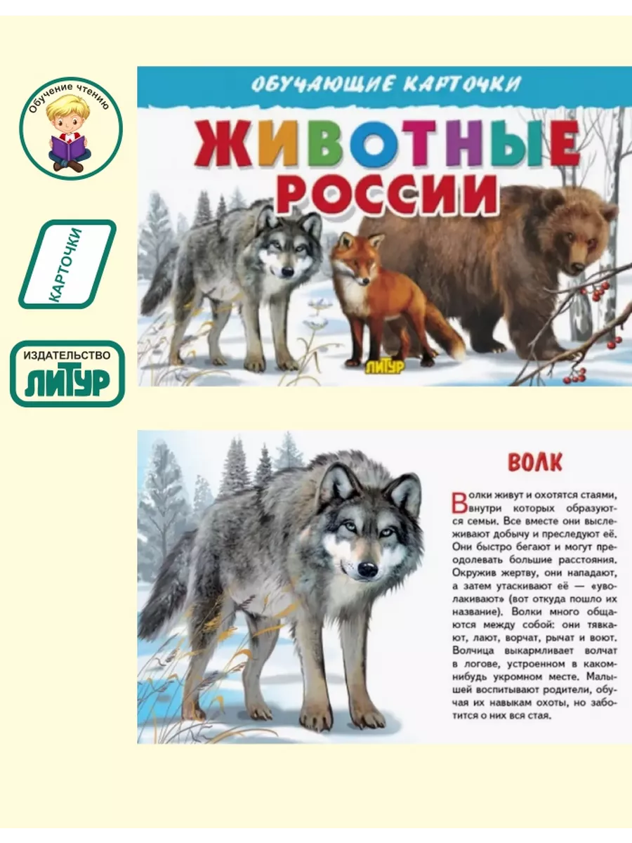 Данный комплект содержит карточки с изображением самых распространенных животных России это белка, барсук, бобр, волк, выдра, горностай, еж, заяц, кабан, лиса, лось, бурый медведь, мышь, олень, росомаха, рысь. В текстах даны некоторые сведения об условиях их обитания и их поведении в природе.