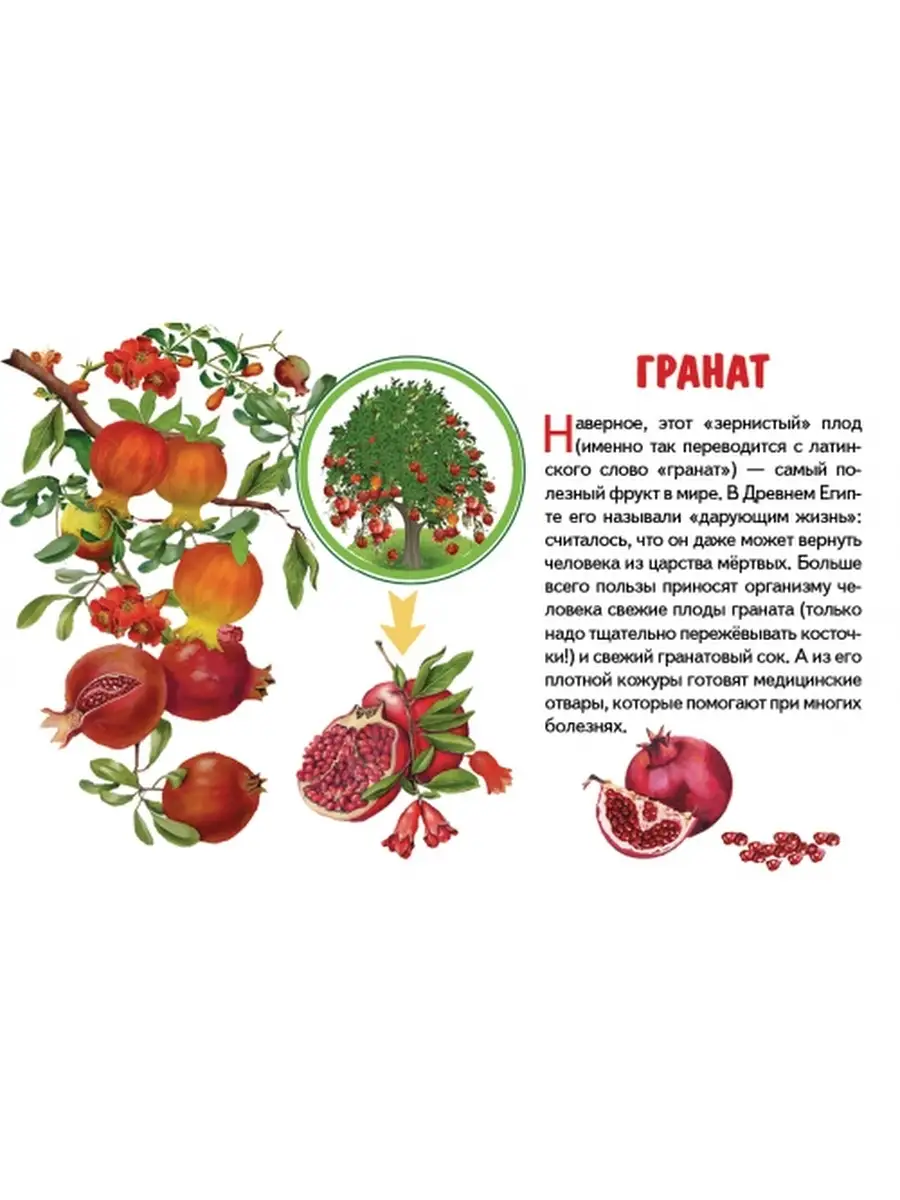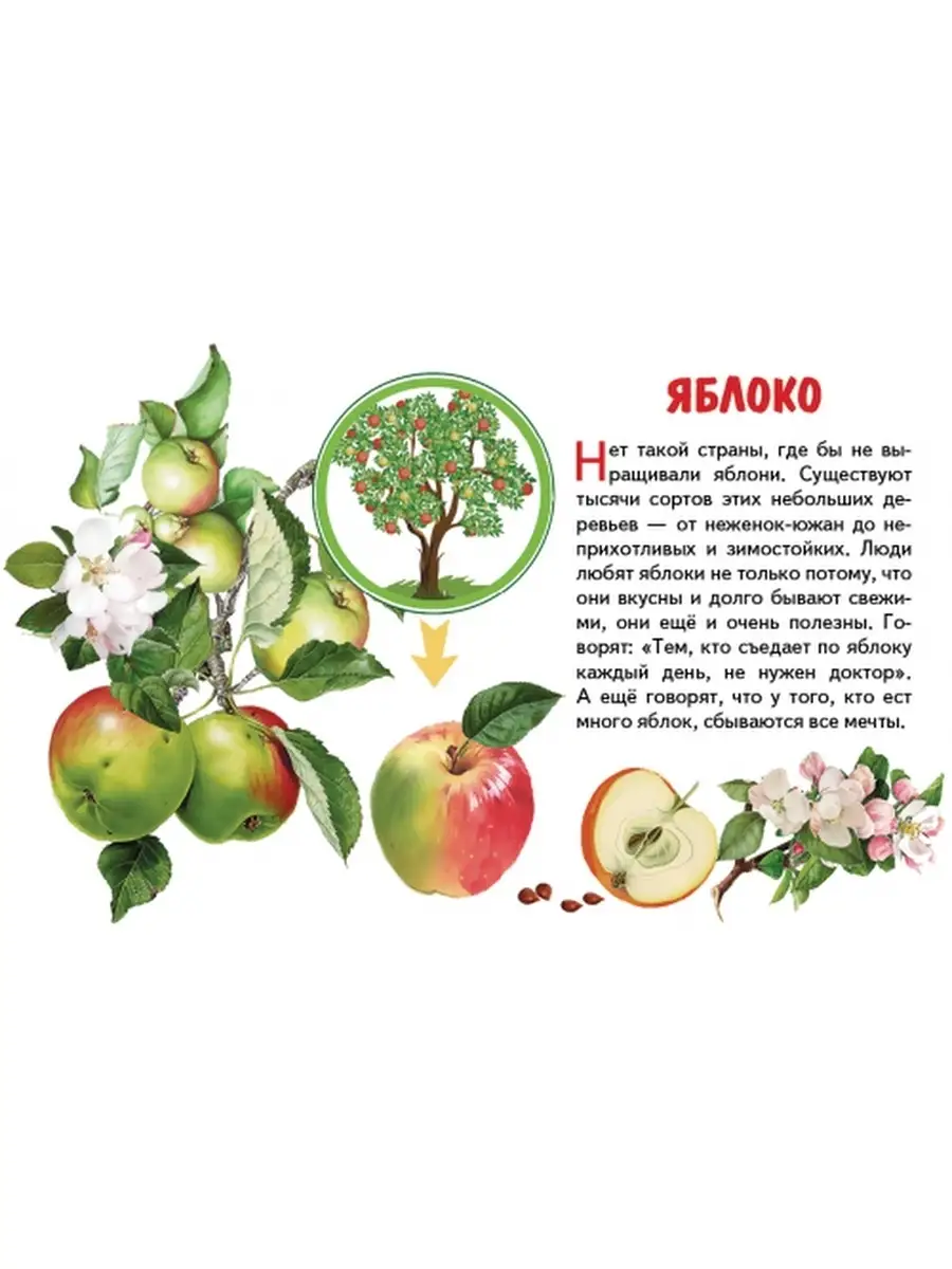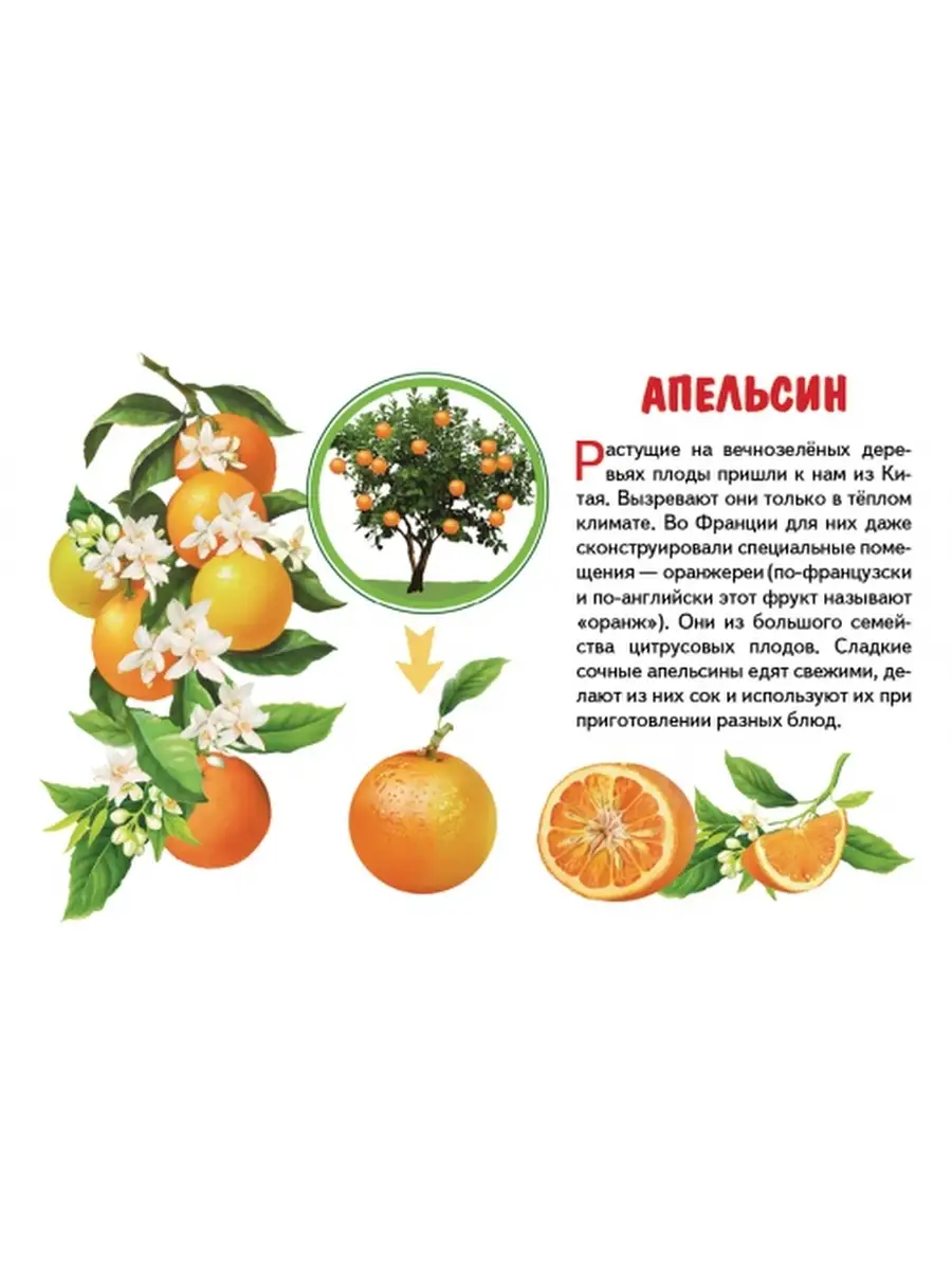 На карточках этого комплекта ребенок увидит, как выглядят фрукты и как они растут. А из короткого текста узнает об истории этих фруктов, о том, какие из них растут в садах россиян, их характерных особенностях и о том, как человек их использует.