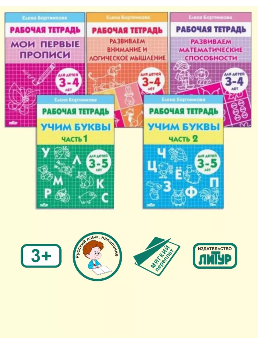В комплект входят рабочие тетради Е. Бортниковой:1. Мои первые прописи (3-4 года)2. Развиваем внимание и логическое мышление (3-4 года)3. Развиваем математические способности (3-4 года)4. Учим буквы (3-5 лет) 1 часть5. Учим буквы (3-5 лет ) 2 частьКомплект упакован в пакет.
