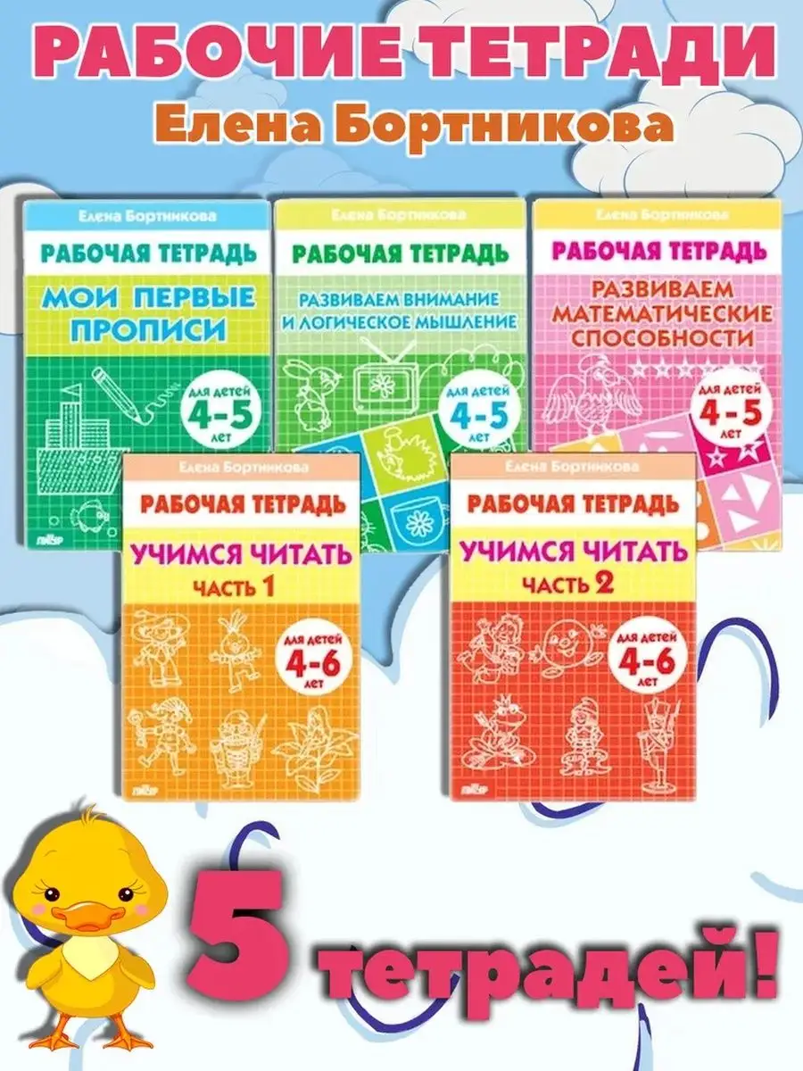 В комплект входят рабочие тетради Е. Бортниковой: 1. Мои первые прописи (4-5 лет) 2. Развиваем внимание и логическое мышление (4-5 лет) 3. Развиваем математические способности (4-5 лет) 4. Учимся читать (4-6 лет) 1 часть 5. Учимся читать (4-6 лет) 2 часть Комплект упакован в пакет.