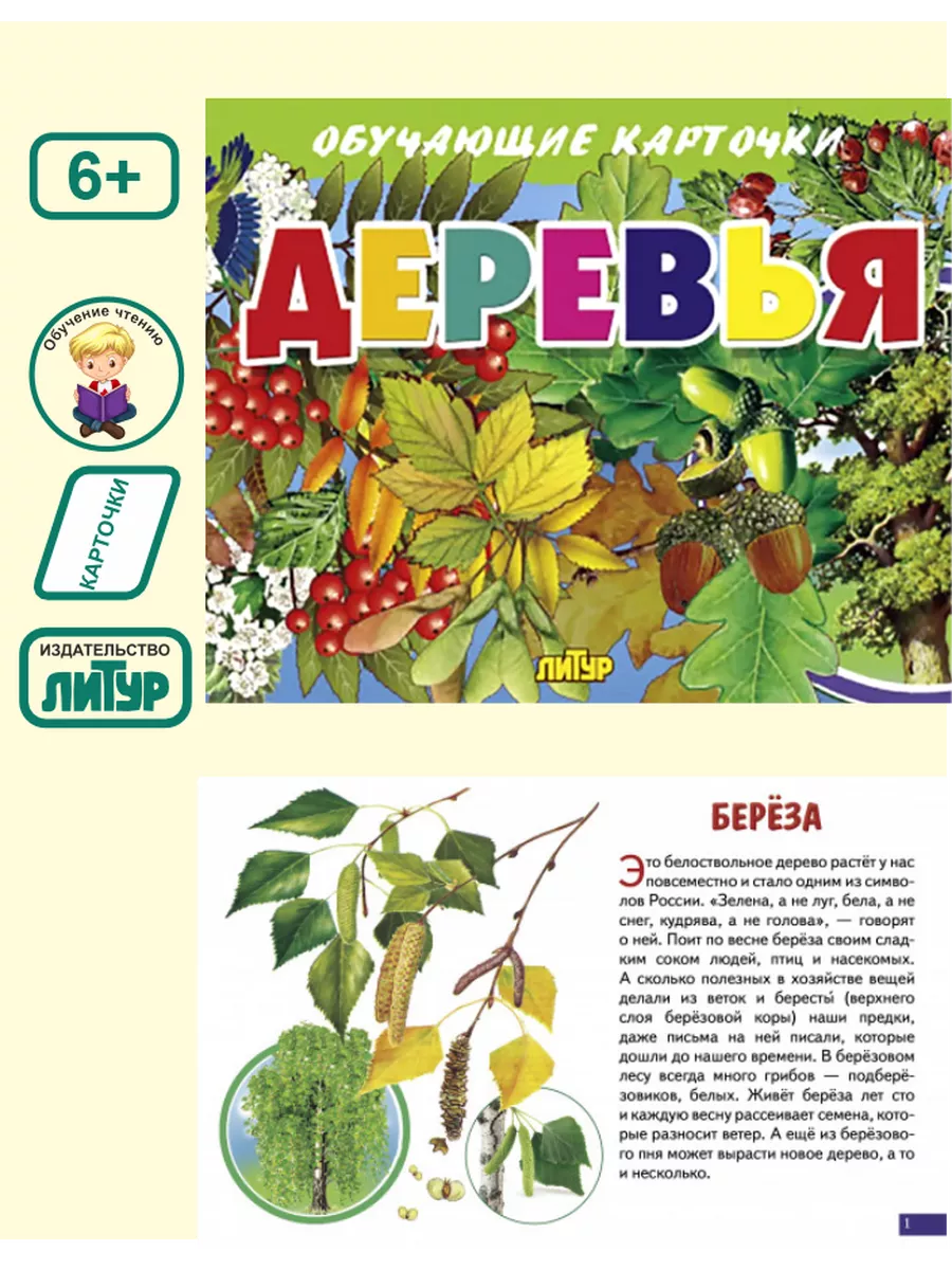 В этом наборе карточек представлены деревья, распространенные в нашей стране и в мире. Ребенок узнает, как они растут, цветут, размножаются, как люди их используют. Текст сопровождается соответствующими картинками: как выглядит дерево, его листья (иголки), цветы и плоды. Набор содержит следующие карточки: береза, боярышник, вяз, дуб, ель, ива, кедр, клен, липа, лиственница, ольха, осина, пихта, рябина, сосна, тополь.
