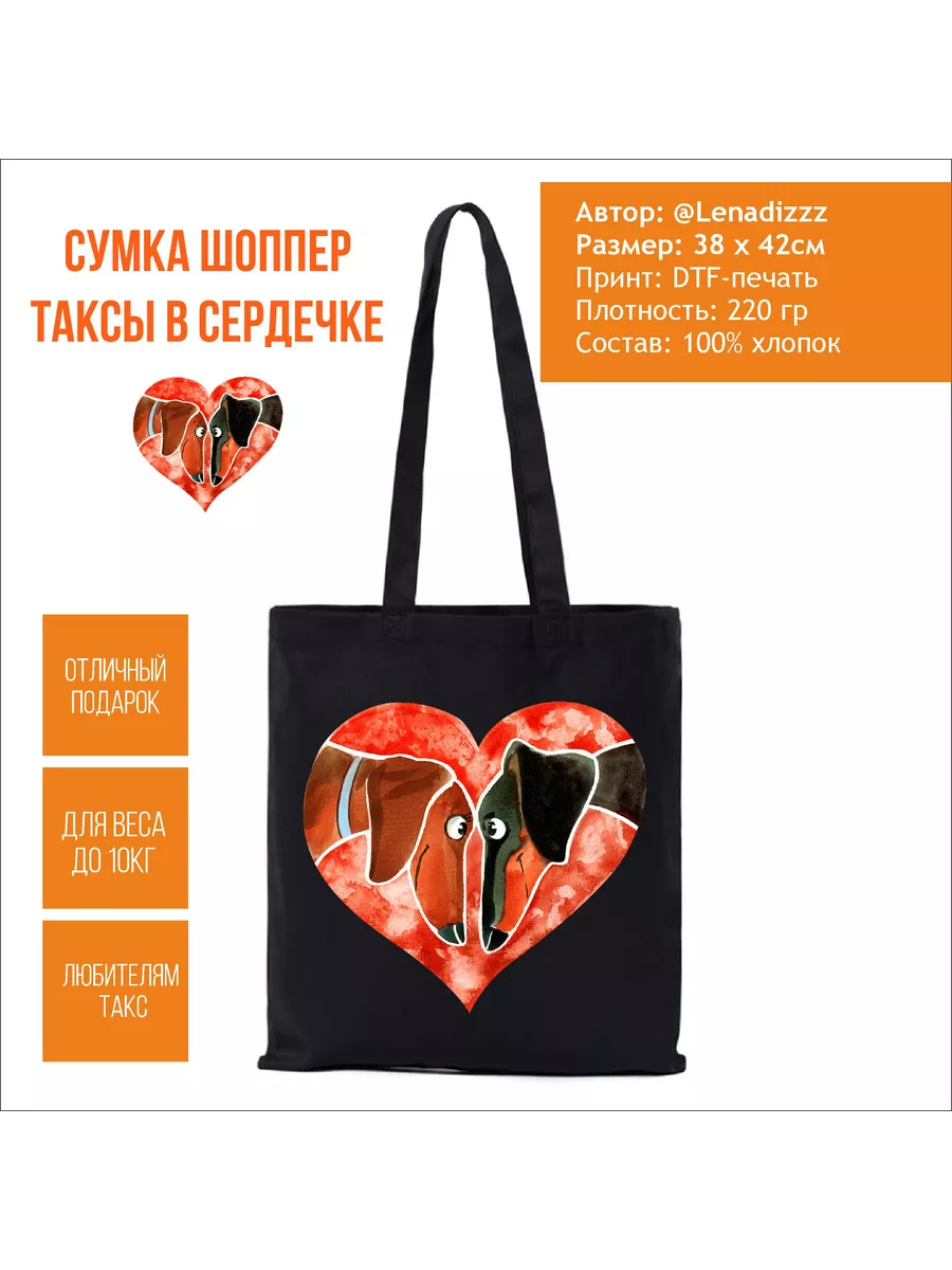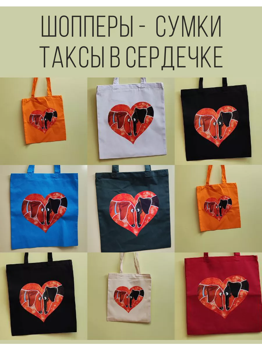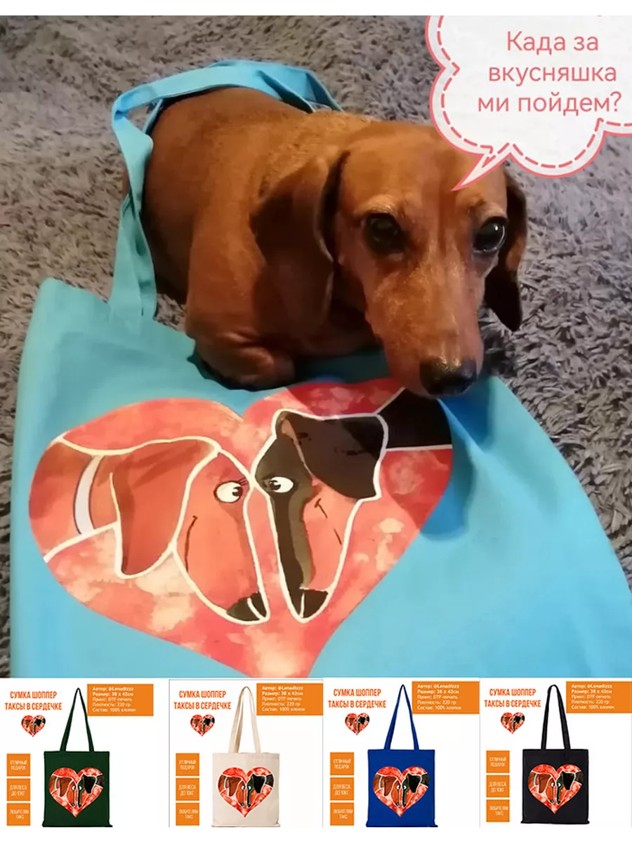 Всем любителям такс! Представляем вашему вниманию тканевый шоппер! Пополняй свою коллекцию такс, такой яркой и вместительной сумкой. Тканевый шоппер - это еще и сохранение экологии. Берите его в магазин, на учебу, на работу, на прогулку в парк (обязательно прихватите своих длинноносых питомцев). Дарите вашим друзьям собачникам. Мешок прекрасно складывается и не займет много места. При правильном уходе (бережная стирка до 30 градусов, отжим на низких оборотах и естественная сушка в расправленном виде) сумочка прослужит вам очень долго.