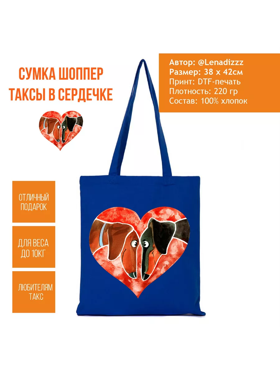 Всем любителям такс! Представляем вашему вниманию тканевый шоппер! Пополняй свою коллекцию такс, такой яркой и вместительной сумкой. Тканевый шоппер - это еще и сохранение экологии. Берите его в магазин, на учебу, на работу, на прогулку в парк (обязательно прихватите своих длинноносых питомцев). Дарите вашим друзьям собачникам. Мешок прекрасно складывается и не займет много места. При правильном уходе (бережная стирка до 30 градусов, отжим на низких оборотах и естественная сушка в расправленном виде) сумочка прослужит вам очень долго.